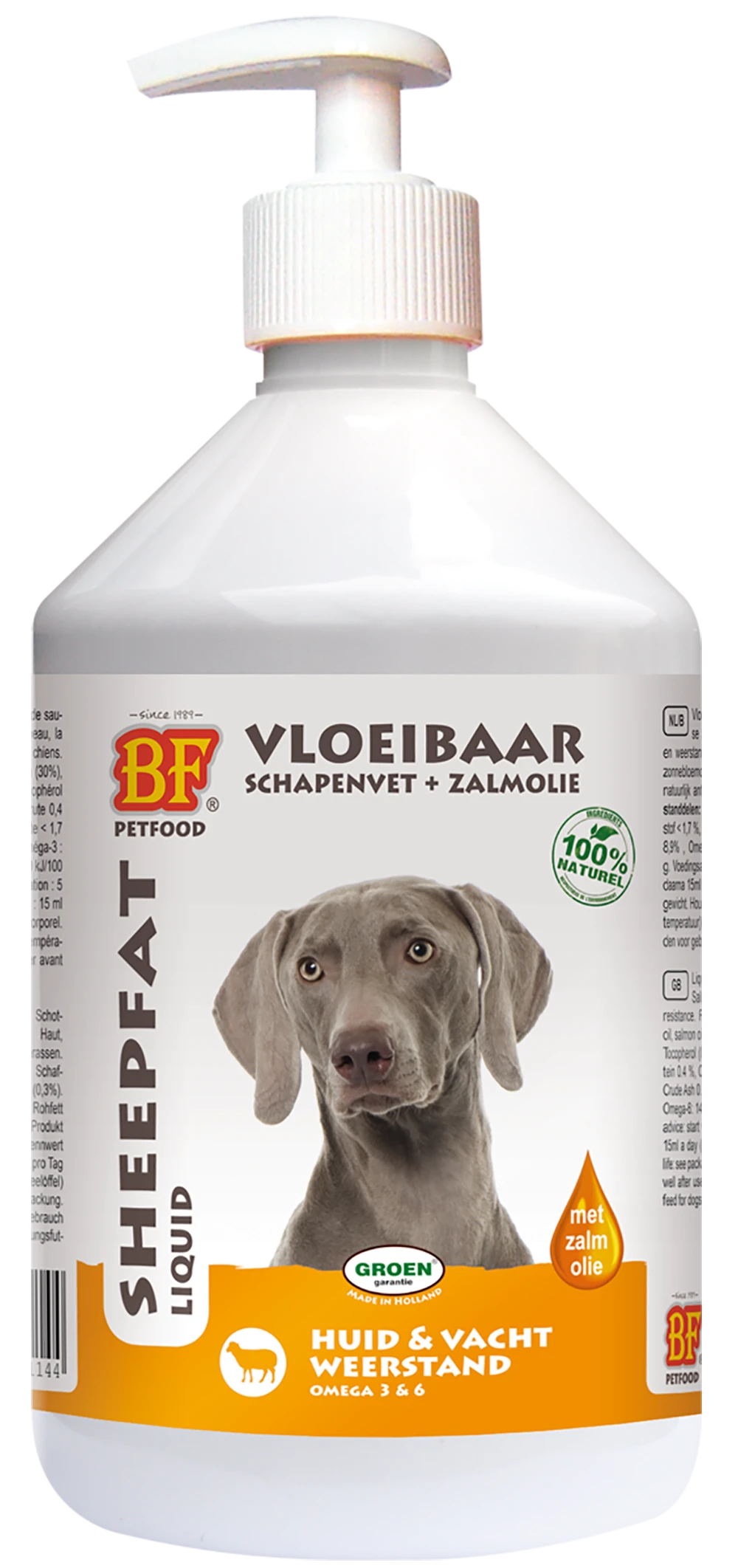 BIOFOOD vloeibaar schapenvet bevat een combinatie van schapenvet, zalmolie (omega 3 en 6) en zonnebloemolie. Vloeibaar schapenvet kenmerken: rijk aan omega vetzuren 3, 6 en 9, met enkelvoudig onverzadigde (omega 9) en meervoudig onverzadigde vetzuren (linolzuur en omega 3 en 6), verbetert voedselopname en spijsvertering, besparing dagelijkse voedingskosten, gezond voor hart en bloedvaten, betere ontwikkeling van de organen, ideaal voor vacht en huid. De vloeibare smaakmaker en de oplossing bij vele huid- en vacht irritaties bij honden. Voor alle hondenrassen.