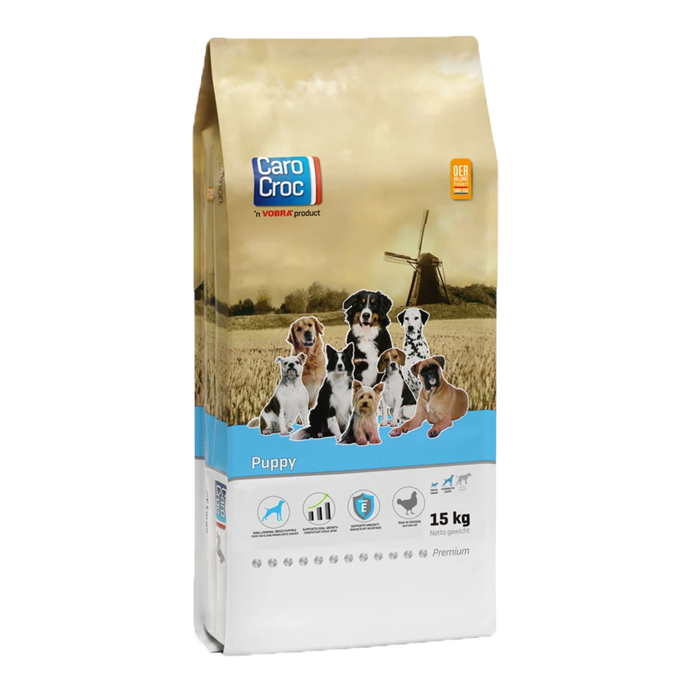 Je pup ontwikkelt zich volop vanaf de geboorte tot 10 maanden voor kleine rassen en tot 15 maanden voor grote rassen. In deze periode wordt het beenderstelsel, het gebit, de spieren en het spijsverteringsstelsel gevormd. Goede voeding is daarom juist in deze fase cruciaal. Voor kleine rassen vanaf 4 weken t/m 10 maanden en voor middelgrote rassen t/m 4 maanden adviseren we om te starten met CaroCroc Puppy. Oudere pups van middelgrote rassen kunnen vanaf 5 maanden overschakelen naar CaroCroc Puppy Large. Pups van grote rassen kunnen vanaf 4 weken direct beginnen met CaroCroc Puppy Large. De optimale verhouding omega-3 en -6 vetzuren van CaroCroc Puppy stimuleert een gezonde huid- en vachtconditie. Daarnaast bevat CaroCroc Puppy gist. Gist ondersteunt in combinatie met vitamine E de Immuunsysteem van je pup. CaroCroc Puppy is goed verteerbaar. Door de uitgebalanceerde samenstelling ontwikkelt je pup zich optimaal en legt daarmee een stevige basis voor een gezond en vitaal hondenleven. Voedingsadvies: voer je pup vanaf de vierde levensweek bij met CaroCroc Puppy. Door de brokjes in het begin vochtig te maken met lauw water, stimuleert u de opname. Eet je pup goed, verstrek de puppybrokjes dan droog. Voer je pup minimaal 2x daags. Het onderstaande voedingsschema vormt de leidraad voor de dagelijkse voergift. Heeft je pup het voer na ongeveer 15 minuten niet op, verwijder dan het restant.
