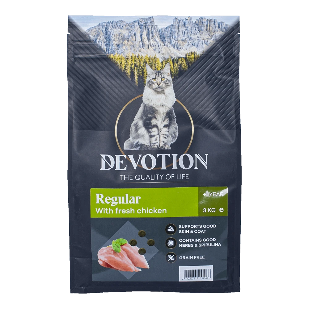 Devotion Regular is een kattenbrokje special samengesteld om te voorzien in de energiebehoefte van katten in de bloei van hun leven. De brokjes zijn gemaakt met hoogwaardige, licht verteerbare ingrediënten, mét verse kip en zonder graan. Aan de brokjes zijn goede kruiden en spirulina toegevoegd om uw kat fit en vitaal te houden.