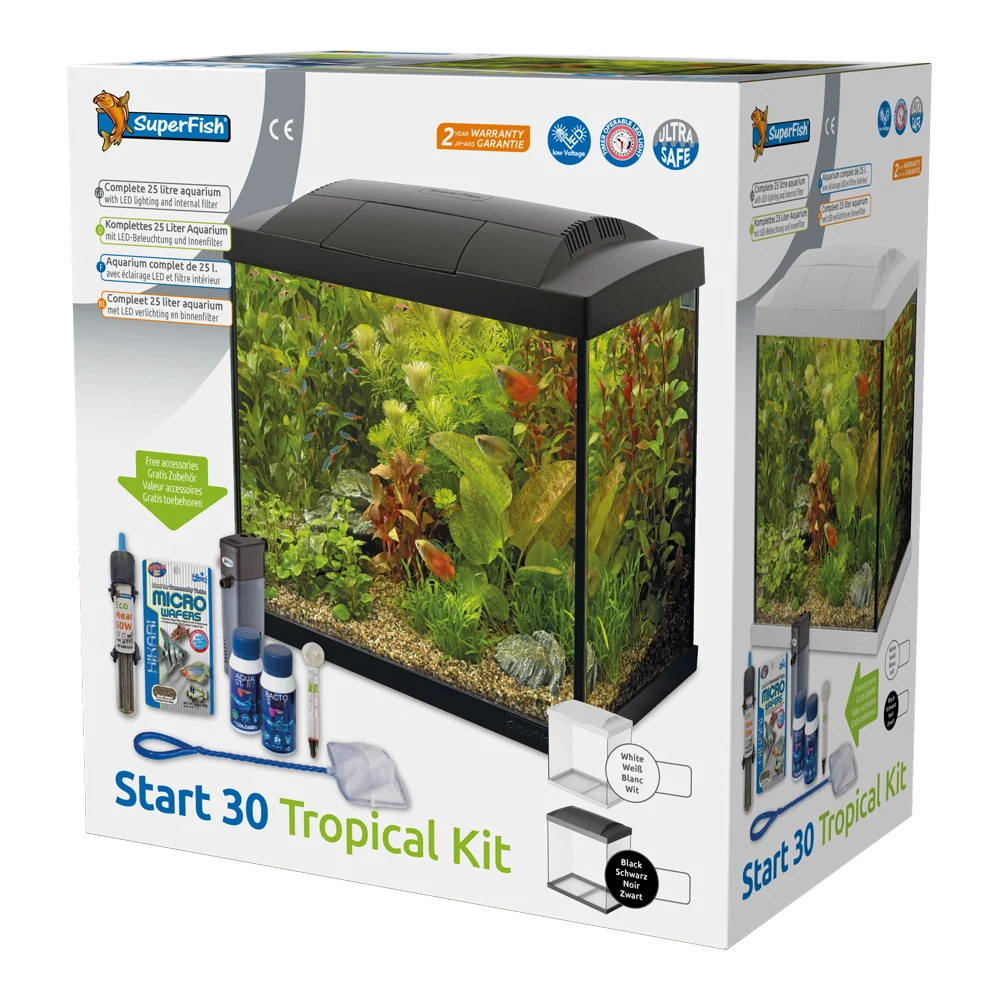 SuperFish Start zijn voordelige complete starterkits met energie zuinige LED-verlichting, binnenfilter en handige accessoires om de aquarium hobby te starten. Verkrijgbaar in zes maten van 20 tot 150 liter, als goudvis- of tropisch aquarium, waarbij deze laatste worden geleverd met een aquarium verwarmer!