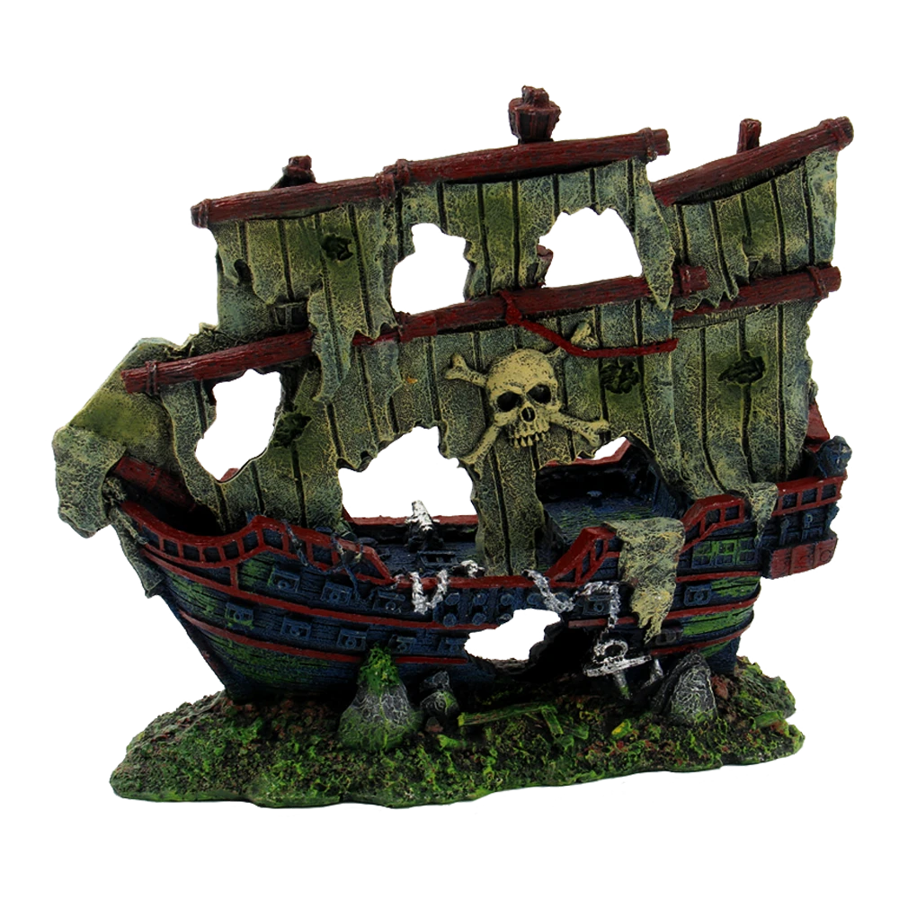 Aquariumdecoraties in de vorm van wrakken van priratenschepen. Het scheepswrak XXL is maar liefst 70 cm breed en 56 cm hoog. Het magneet scheepswrak lijkt uit het aquarium te varen, waardoor het er spookachtig uitziet.